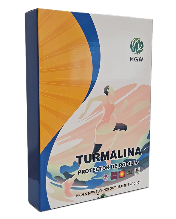 Protector de rodilla elaborado con turmalina y materiales duraderos. Presenta un diseño ergonómico ajustable que mantiene la forma y estructura característica del producto.