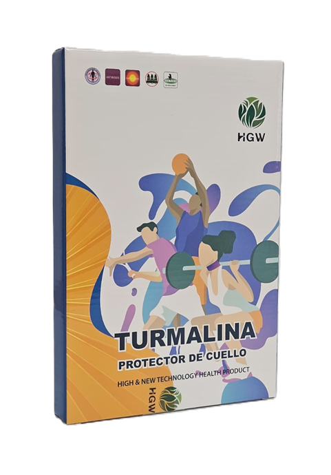 Protector de cuello elaborado con turmalina y materiales duraderos. Presenta un diseño ergonómico ajustable que mantiene la forma y estructura característica del producto.