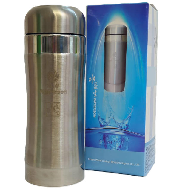 Vaso portátil de acero inoxidable con turmalina, capacidad 500 ml, diseño anatómico y ligero, conservando las propiedades naturales del mineral en contacto con líquidos.